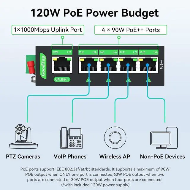 PoE++ Switch: 2-5 port support the IEEE 802.3af/at/bt protocols and can provide up to 90W output. Total power budget is 120W.