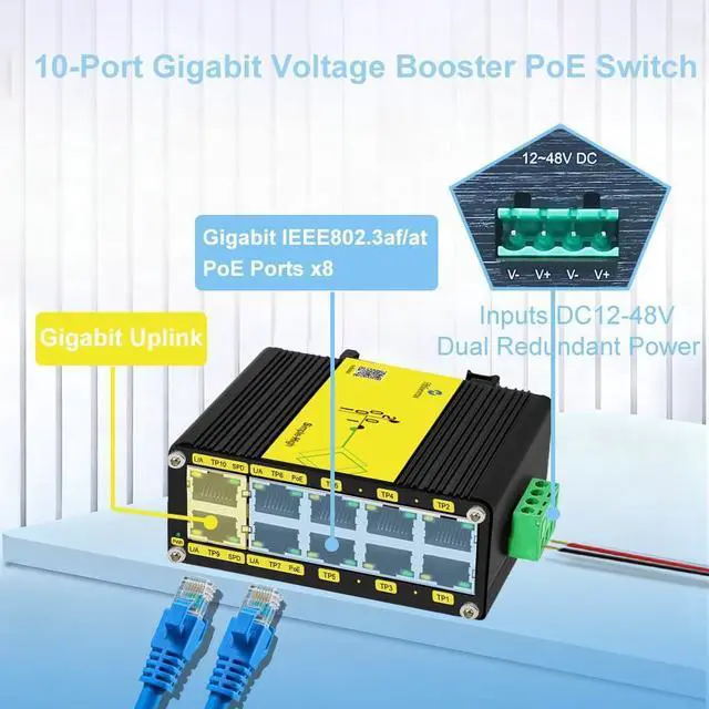 + : Provide 8 PoE 10/100/1000 Mbps RJ45 ports and 2 gigabit uplink. Supports auto-negotiation and 10/100Mbps half/full duplex and 1000Mbps full duplex.