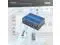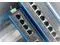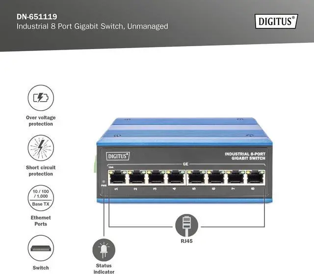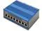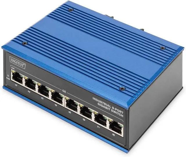 The industrial Ethernet switch has 8 RJ45 ports with gigabit Ethernet speeds and comes in a robust, compact black and blue metal case.