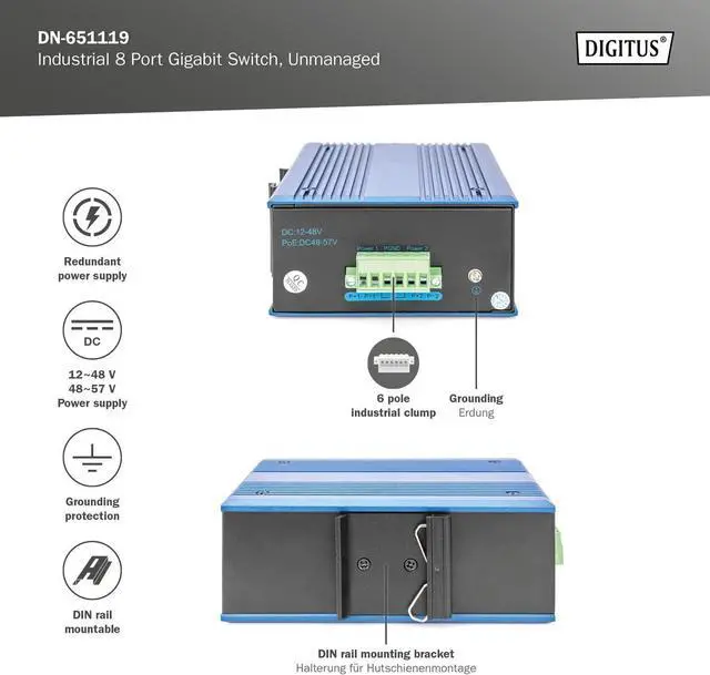 The power supply is designed redundantly and is connected via a terminal connector. The Network Switch also has lightning, short circuit and surge protection
