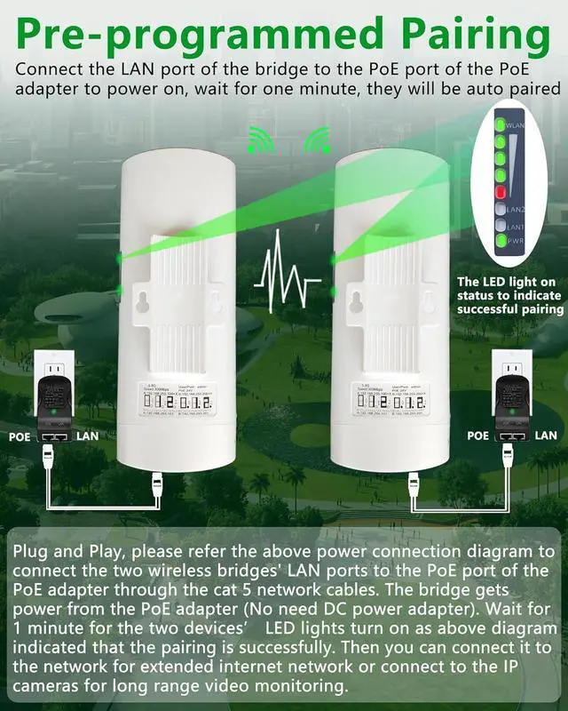 Easy to Pair: CPE1201 Wireless bridge adopts AB automatic networking. Just transfer one end to A as the master bridge and the other end to B as the slave bridge, then you can easily configure it without entering the GUI. This wifi wireless bridge support point-to-point, point-to-multipoint pairing.