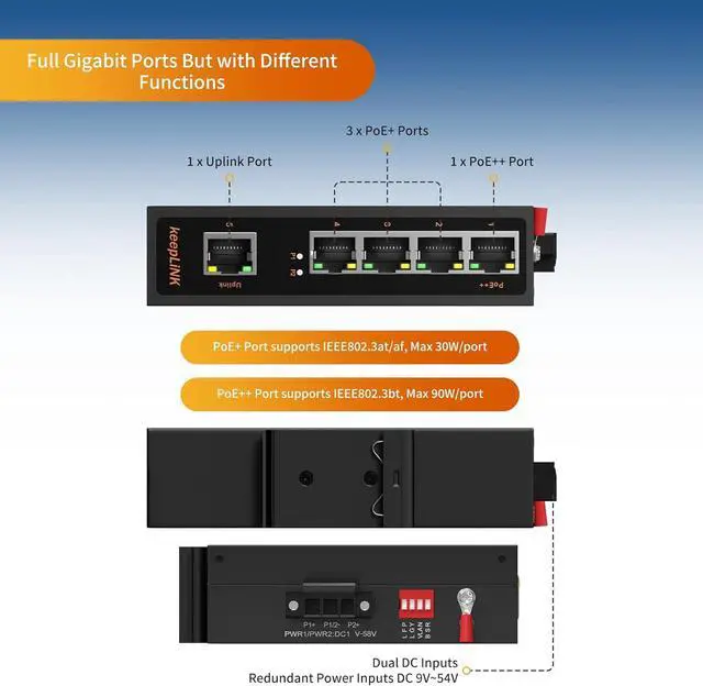 Industrial 5-Port Gigabit PoE Switch3 PoE+ ports (supports IEEE802.3AF/AT, max 30W/port), 1 PoE++ port (supports IEEE802.3AF/AT/BT, max 90W/port), 1 Uplink Port. Total PoE power budget: 125W (DC24V/DC58V input) or 65W (DC12V input).
