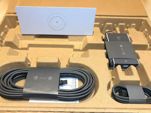 Experience high-speed internet connectivity with this advanced Star-link router system. The sleek white router features a minimalist design with a distinctive circular pattern on top, complementing any modern home or office setting. The package includes the main router unit, power adapter, and necessary cables for quick setup. This next-generation router comes with straightforward LED indicators for status monitoring and delivers reliable performance for your satellite internet connection. The compact form factor makes it easy to position anywhere in your space, while the included mounting options provide flexible installation choices. The router's sophisticated internal components are engineered to optimize your connection to Starlink's satellite network, ensuring consistent connectivity for streaming, gaming, and daily internet usage. Setup is streamlined with included cables and power supply, getting you connected with minimal hassle.