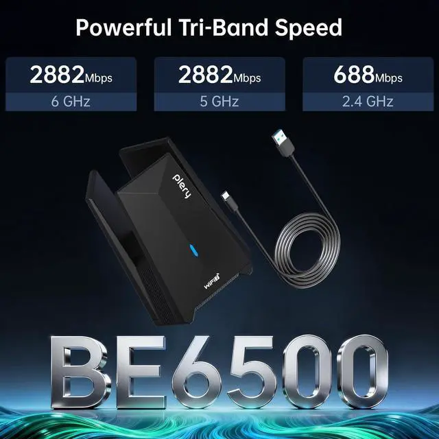 Tri-Band USB Wireless Adapter Experience exceptional performance with dedicated bandwidth on each band: 6GHz(2882 Mbps), 5GHz(2882 Mbps), and 2.4 GHz(688 Mbps), providing smooth and stable connectivity even in dense wireless environments.