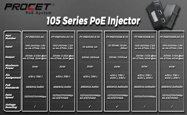 The 60W PoE injector offers a versatile range of data rates, from 10/100/1000Mbps to the high-speed options of 2.5/5/10GbE, ensuring compatibility with a wide array of network devices.