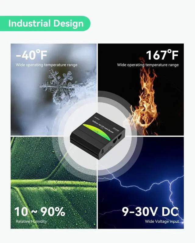INDUSTRIAL DESIGN -Aluminium housing; Wide voltage input 9-30V DC and wide operating temperature range -40°F ~ 167°F (-40°C ~ 75°C), suitable for harsh environments.