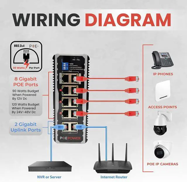 IEEE802.3af/at active POE output on all 8 POE ports. Up to 30 watt output capability on each port. If the switch is powered by 12V DC, total output budget will be 90 watts. If the switch is powered by 24V DC or higher, the total output budget will be 120 watts