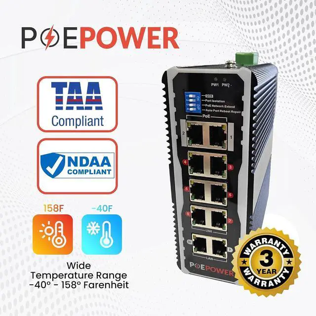 3 Year Warranty. TAA Compliant. NDAA Compliant. Din Rail Mount Included. Heavy Duty Metal Construction. 5.875" x 4.875" x 2.25"