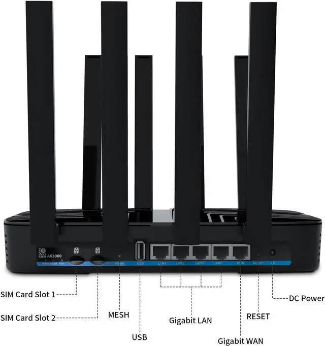 Dual SIM Flexibility & Wide CompatibilitySupports 2 Nano SIM slots + 2 eSIMs (dual-mode dual standby) and includes 4 high-gain antennas. Ideal for rural areas, vehicles, and temporary offices with unstable broadband