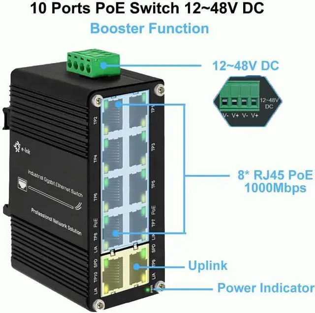 Booster Function Up to 240-watt PoE budget- PoE Budget: Up to 240-watt PoE budget (48V DC), Up to 90-watt PoE budget (24V DC), Up to 60-watt PoE budget (12V DC)