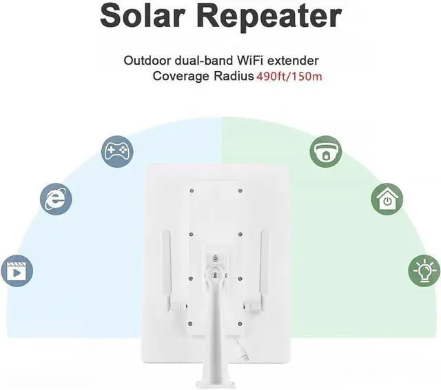 [UNMATCHED SIGNAL RANGE] Achieve strong WiFi signals in outdoor areas up to 490 feet away with our dual band extender featuring high gain antennas and a powerful solar panel.