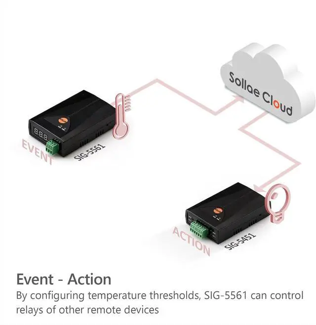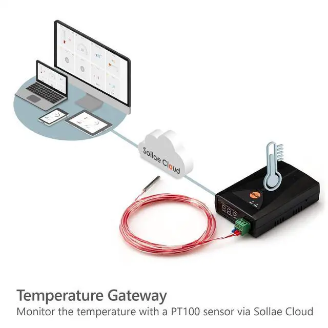 Device reads temperature from PT100 and sends it to Sollae Cloud for monitoring and visualization