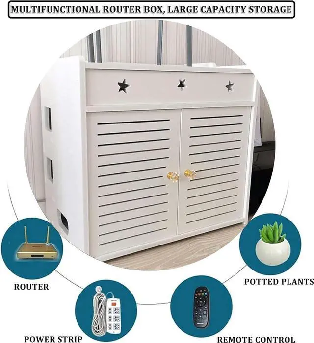 **Product Description:**Elevate your home organization with the VEGIONES WiFi Storage Box. Designed to streamline your space, this cable management solution is essential for keeping your environment tidy and clutter-free. Say goodbye to tangled cords and unsightly wires our router storage box is here to revolutionize your setup.Crafted from premium wood, our storage box boasts durability and sophistication. Its simple and modern design seamlessly integrates into any room, whether it's your living room, office, desk, or bedroom. Available in multiple sizes, you can choose the perfect fit for your space, ensuring a tailored solution to your organizational needs.Not just a functional addition to your home, our WiFi storage box is a statement piece that enhances the aesthetic appeal of your environment. With its versatile application and customizable sizes, it caters to a wide range of preferences and requirements.Product Specifications-Material: PVC-Color: As shown-Size: 40x26x37cm/15.7x10.2x14.5 inch-Style: simple and modern-Scope of application: living room, office, desk, bedroom, etc.NoteThe router box is not suitable for all types of routers.Please check the size of the outer box carefully before purchasing,and confirm the size of your router.At VEGIONES, customer satisfaction is our top priority. Rest assured that when you choose our WiFi storage box, you're investing in quality and reliability. Explore our collection today and discover the perfect storage solutions to elevate your space.About the sales list-This shop only sells router storage boxes,and other pictures are not included.