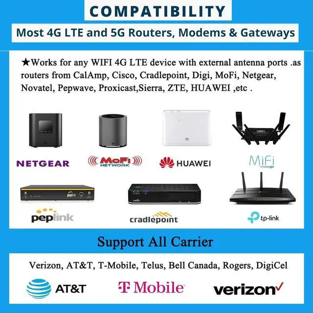 If your LTE/ 4G/ 5G signal strength is low, please use this mimo panel antenna. capture 698-2700MHz cellular signal band from all the carrier (Verizon, AT&T, T-Mobile, Rogers, Bell, Telus, and more).