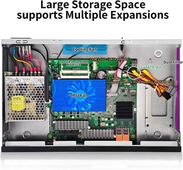 Storage: 1 x M.2 SSDSATA protocol), 2 x SATA Slot, 1 x mPCIE (Support 3G/4G module and SATA solid state drive)