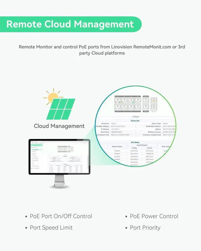 Remotely Cloud Managed - Via WEB GUI or RemoteMonit CLOUD. It supports VLAN, QOS and PoE port management, including PoE On/Off control, Power budget, priority, etc.