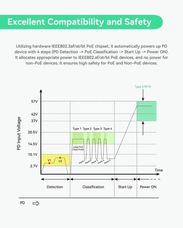 4 BT 90W PoE++ - Port 1-4 support BT 90W output, sufficient power for all IEEE 802.3af/at/bt PoE devices in the market, including IP cameras, PTZ cameras, Access Point, VoIP phone, PoE light, PoE monitor, etc. (Total PoE budget is 300W)