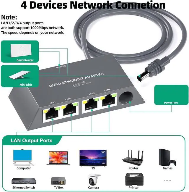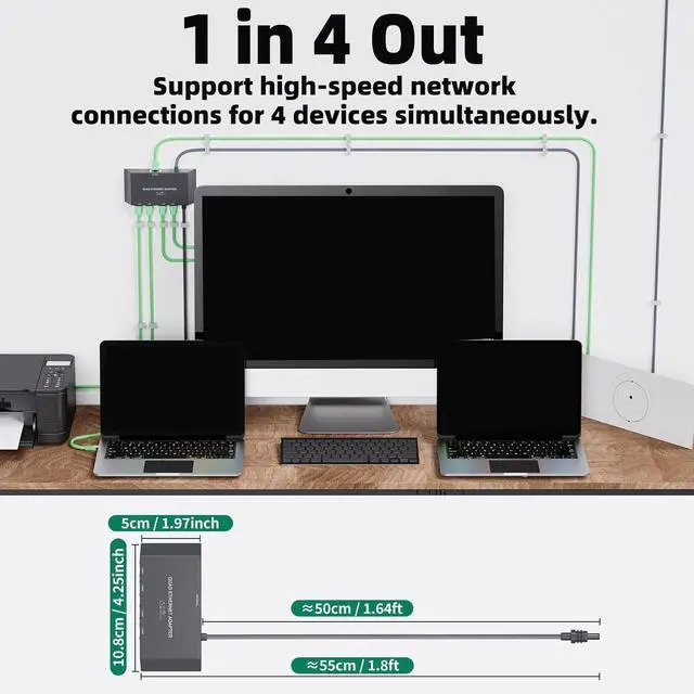 [Connect 4 Devices Simultaneously] Adapter Gigabit Ethernet Splitter 1 to 4 provides a very efficient network expansion solution.