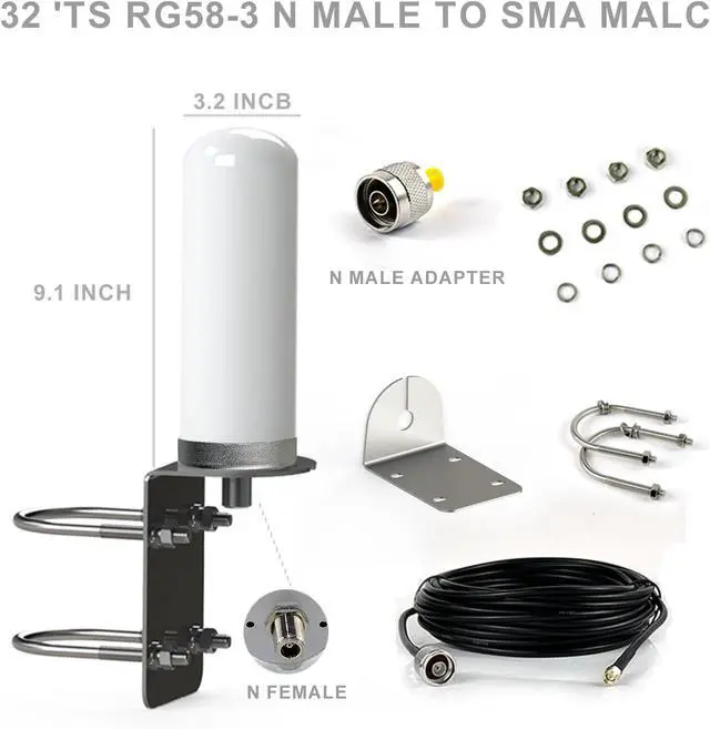 What you get: 1 antenna and 1 set of hardware (bracket, U-bolt, nut) and 10m RG58/50-3 cable (N male to SMA male) and TS-9 adapter and N male adapter.