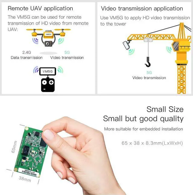 RF power & Transmission DistanceRF power: 2.4G is 15dBm/16.5dBm optional, 5G is 19dBm/23dBm optionalTransmission distance (5G point-to-point barrier-free, small data transmission): about 200 meters
