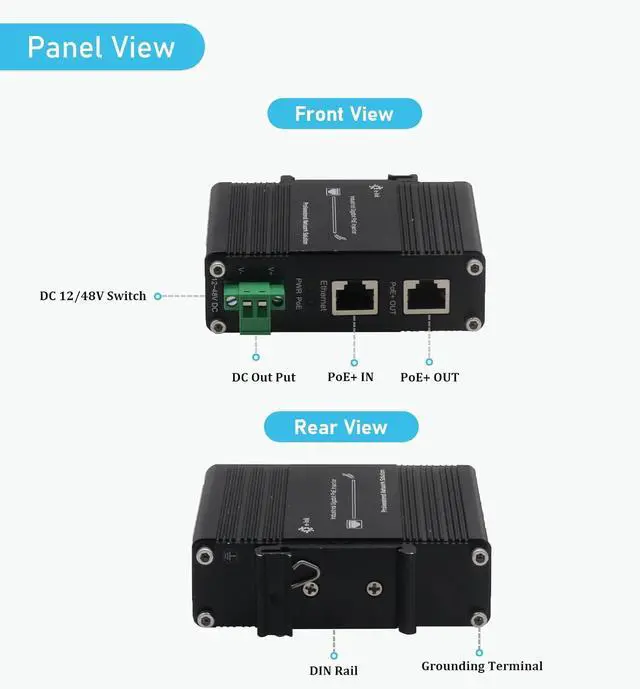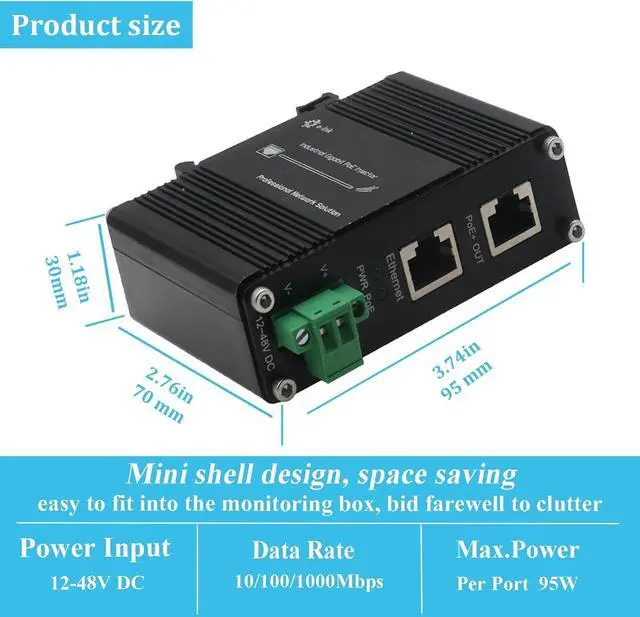 PoE++ Injector:This advanced PoE++ injector comes with one Gigabit RJ45 data input port and one Gigabit PSE output port, packing simultaneous high-speed data transmission and power delivery into a compact, space-efficient unit.