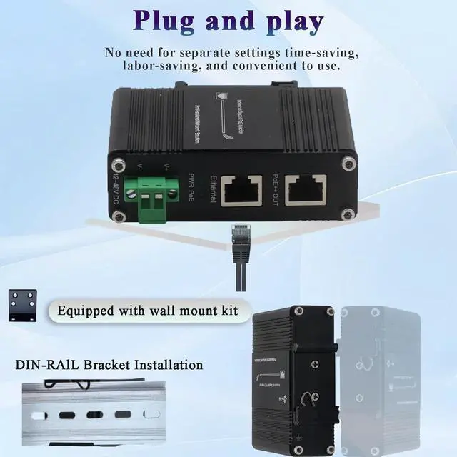 Application &Wide Installation Methods:It can offer power supply for POE products such as Wireless Access Point, PTZ camera, Cash register etc.Environmentally Hardened -40°C to 80°C Support DIN-Rail & Wall-mount installation