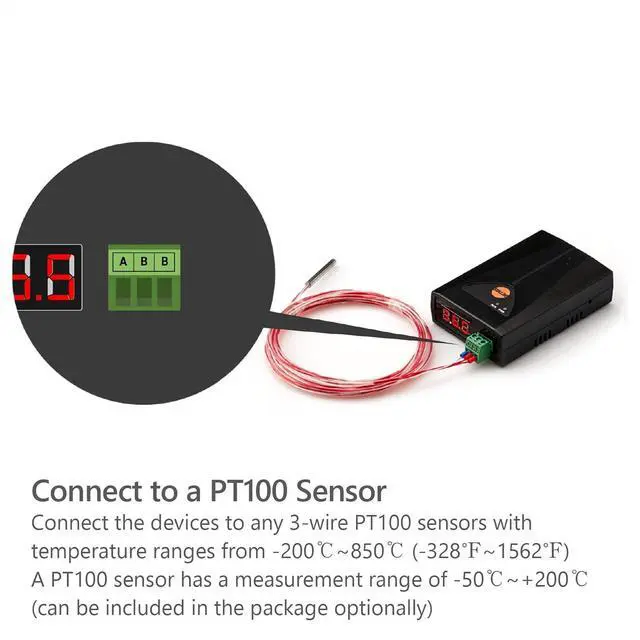 PT100 connection port (support 3-wire PT100 sensor) and a red 3-digit 7-segment LED display