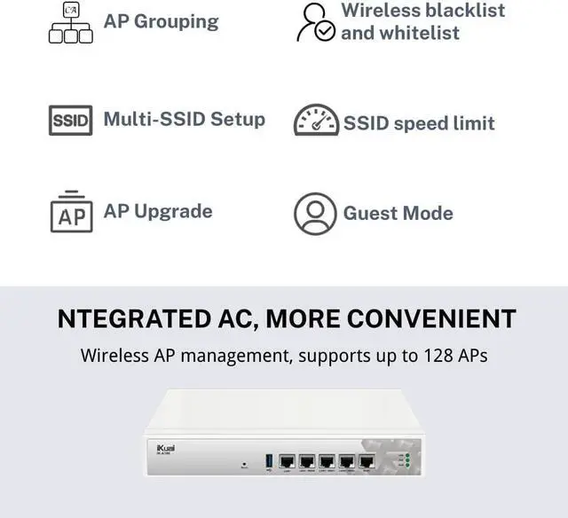 One Box, Whole-Campus ControlIntegrates a full wireless AC controllerdeploy, upgrade and monitor up to 128 access points from a single dashboard