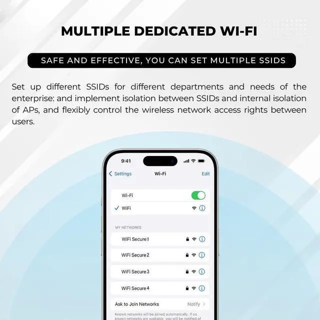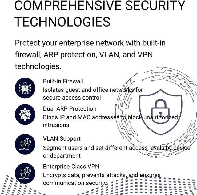 Enterprise-Grade SecurityDual ARP binding, DDOS & flood defence, stateful firewall, URL/keyword filtering, IPMAC ACL pass audits and protect data