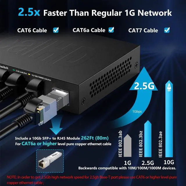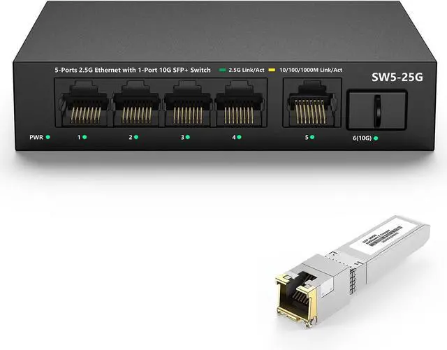 2.5G Super-FastThis 2.5 gigabit switch features 5x2.5G RJ45 ports and 1x 10G SFP port, providing higher-speed connectivity for your devices and allowing you to easily upgrade your network to support the latest 2.5G ethernet standard. NOTE: To get 2.5GB high network speed please use CAT6 or higher level pure copper ethernet cable. Please make sure other network products come with 2.5GB network cards to get whole network 2.5GB speed, otherwise the network speed will be determined by the lowest