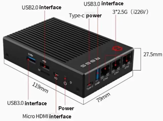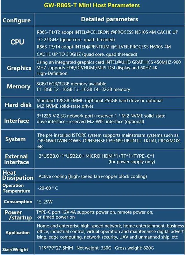 • GW-R86S-T1: N5105+8GB Memory+128GB Hard Drive+3*1226V 2.5G+2*USB 3.0+1*USB 2.0+TYPE-C power supply+Supports M.2 NVME solid-state drives and M.2 WIFI/BT modules (optional)