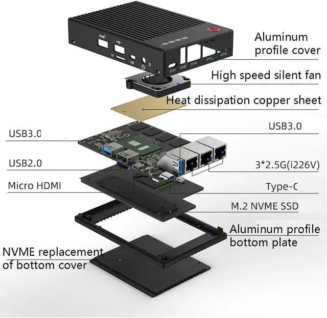 GW-R86S-T1: N5105+8GB Memory+128GB Hard Drive+3*1226V 2.5G+2*USB 3.0+1*USB 2.0+TYPE-C power supply+Supports M.2 NVME solid-state drives and M.2 WIFI/BT modules (optional)