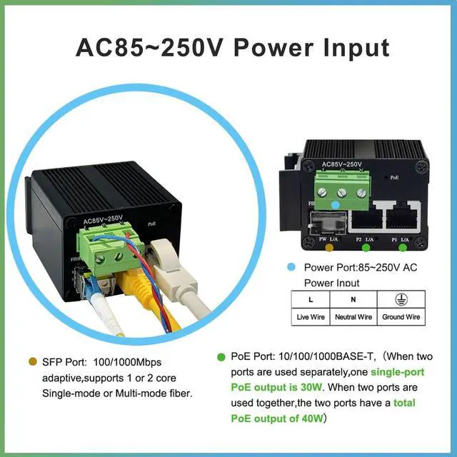 This 1000M Fiber Switch supports 85~250V AC power supply and 6KV lightning protection