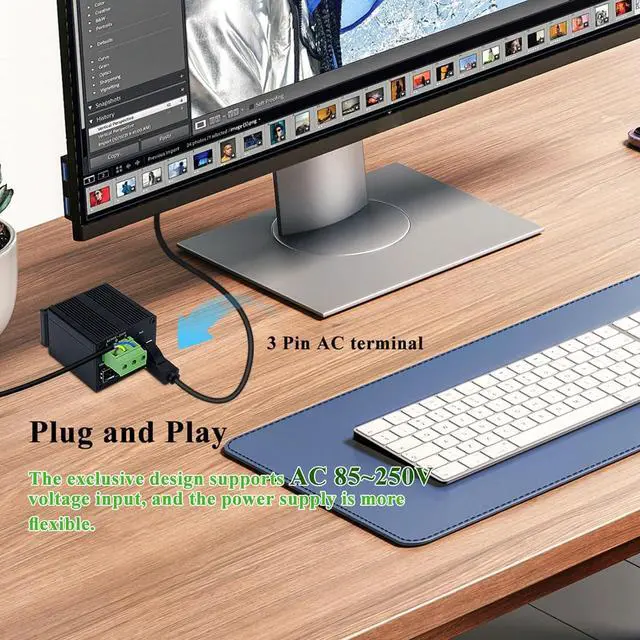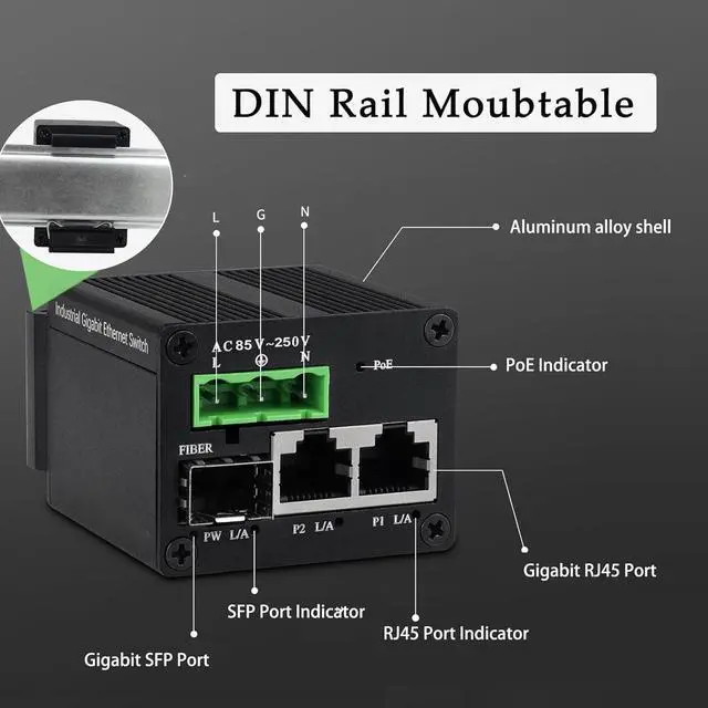 This 2 RJ45 + 1 SFP Switch has an IP40 aluminium shell body. Strong and durable, good heat dissipation. Through the aluminum shell body surface heat dissipation, no noise and silent working