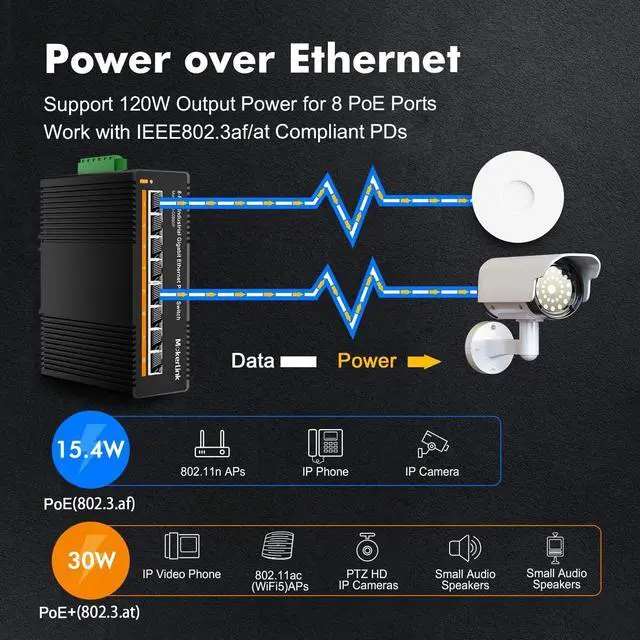 The poe port 1-8 support IEEE802.3af/at standard, can connect multiple poe devices, such as POE camera, poe ap, etc. Please note that passive 24v poe is not supported. His POE input DC voltage is 48-57V, so please use a input voltage above 48V to provide POE, if it is 12V, it cannot provide POE