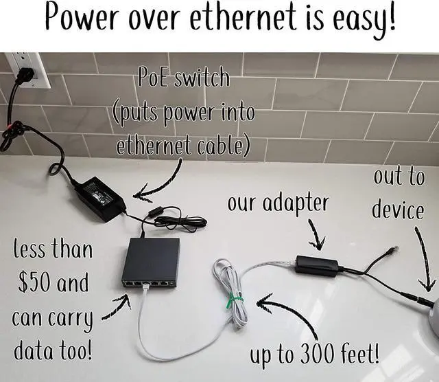 You will also need an Ethernet Switch with PoE Ports to inject the low-volt power into your ethernet cable where internet comes into the structure. These are around $50 and can be purchased on this site. We like the TP-Link TL-SG1005P.