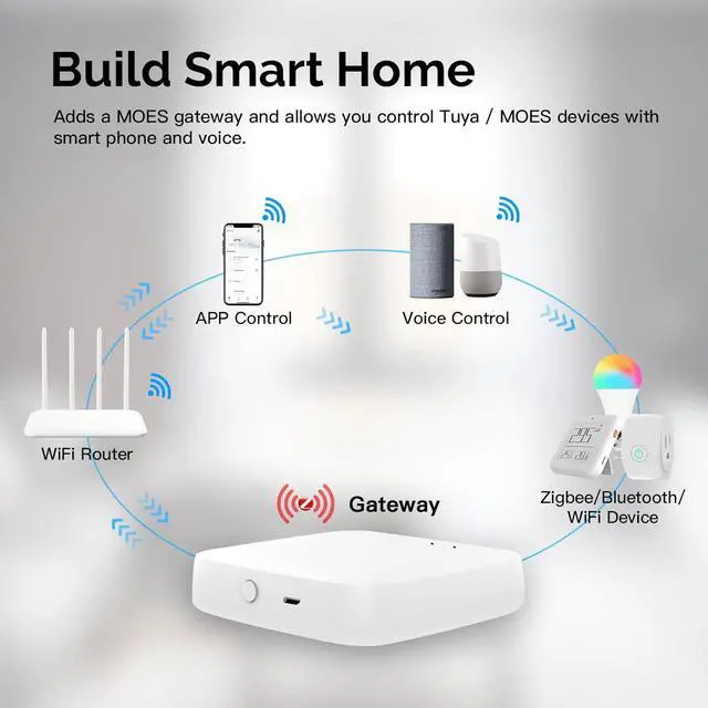 2 Modes in 1 GatewaySupport MOES/Tuya Bluetooth mesh (SIG) + Zigbee3.0 multi-protocol communication. Only one gateway is needed to connect devices of different protocols to the 2.4Ghz network.