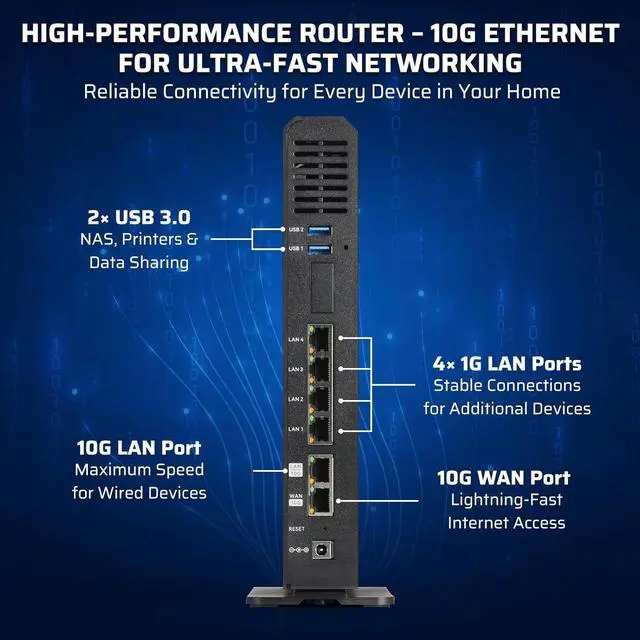 Reliable connectivity for every device in your home: Equipped with one 10G WAN port for lightning-fast internet access, one 10G LAN port for high-performance wired devices, and four 1G LAN ports for additional connections.Two USB 3.0 ports allow for quick data sharing, NAS setup, or printer connection.