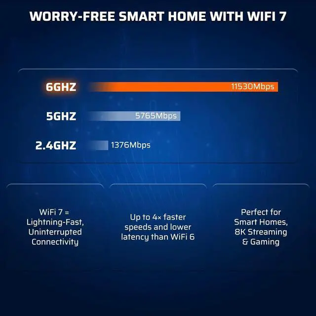 Revolutionary Wi-Fi 7 speed: With Wi-Fi 7, you can reach up to 19,000 Mbps total throughput (2.4 GHz 1376 Mbps | 5 GHz 5765 Mbps | 6 GHz 11,530 Mbps) up to 4 × faster than Wi-Fi 6 delivering ultra-low latency ideal for smart homes, 8K streaming, and competitive gaming.