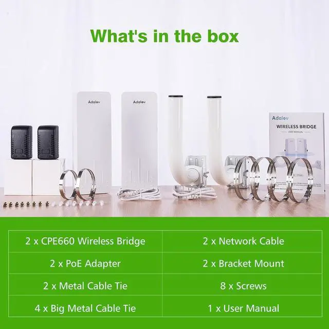 Experience Extended Reach with the CPE660 5.8G Wireless Bridge wireless bridge for network extend Proper Wireless Bridge Installation: Face-to-Face with No Obstructions Support POE (power over Ethernet) and Dial Pairing Support 24V POE (2 Adapters included) One key Bridge - Supports Dial Pairing No Need for Expensive Cabling -- Network Extension Outdoor Wireless Bridge for All Weather Use All in One Package