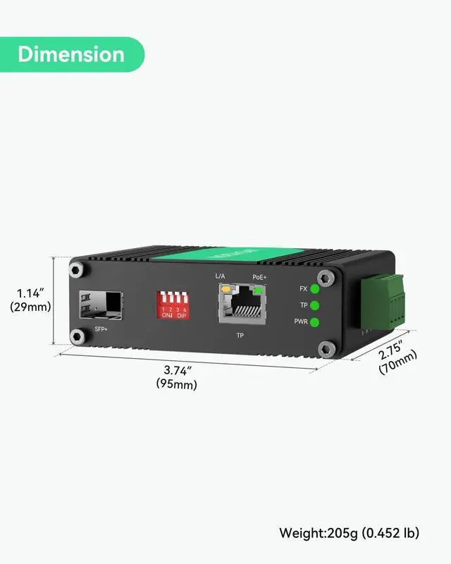 FIBER TO POE CONVERTER: Support converting Optical Ethernet signal into electrical Ethernet signal with PoE, featuring a 10GBASE-X SFP+ interface