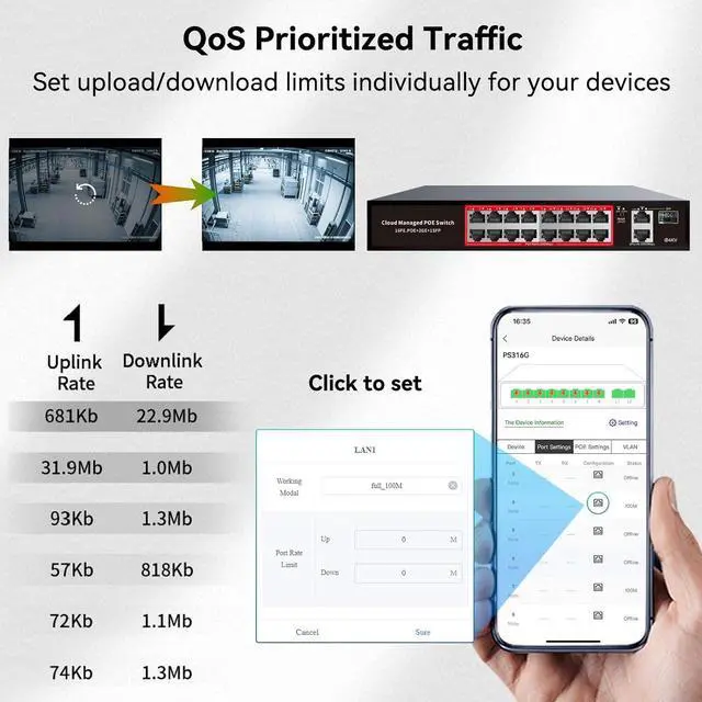 Smart Management Control Your Network from Anywhere: STEAMEMO 16 ports PoE+ switch Manage your network effortlessly with web interface, desktop software, or mobile app. Monitor real-time traffic, prioritize devices with QoS, and configure VLANs (802.1Q) for better security. Ideal for users who want "smart managed switch" features without complexitygreat for home offices, remote work, and small business networks.