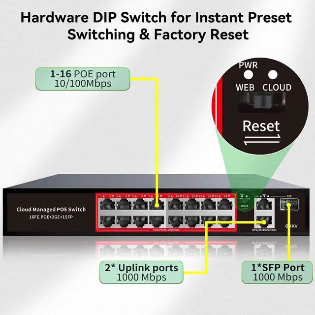 Cost-Effective, Durable Design for Long-Term UseThe STEAMEMO 16-port PoE+ ethernet switch features a rugged casing and advanced heat dissipation, paired with low-power, fanless operation for silent, long-lasting performanceeven under heavy loads. Plus, its intuitive visual interface simplifies remote management: easily monitor network status, configure devices, and troubleshoot on-site issues without needing to be physically present.