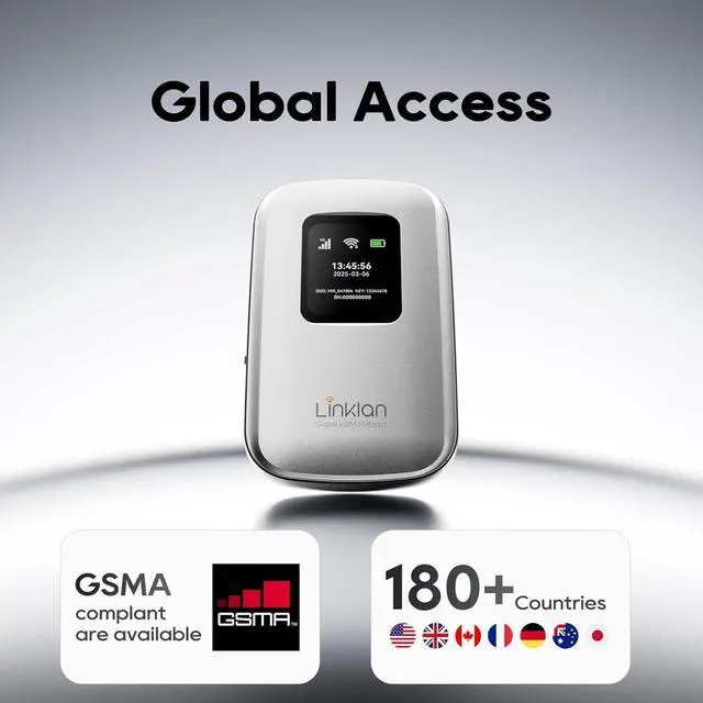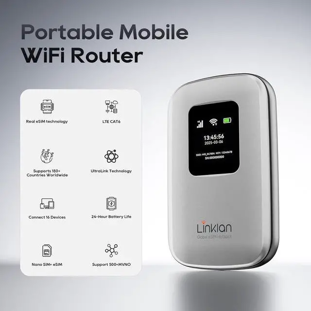 Ultra-Fast 4G LTE with Global Coverage The Linklan eSIM mobile hotspot offers 4G LTE Cat 6 connectivity, supporting 30+ global frequency bands. Enjoy seamless roaming in over 180 countries and regions, making it ideal for international business travel and global journeys. With speeds up to 300Mbps via dual-band WiFi, it ensures smooth performance for business, video calls, and high-definition entertainment.