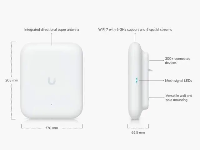 The U7-Pro-Outdoor-US is a high-performance Wi-Fi 7 Tri-Band Access Point built for rugged outdoor deployments. With 6 spatial streams, 2.5GbE PoE+ uplink, and coverage up to 5,000 ft², it delivers ultra-fast, reliable connectivity for dense environments. Directional and omni antennas provide flexible signal shaping, while IPX6/IP67 weatherproofing ensures durability in harsh conditions. Advanced roaming, guest portal features, and secure access protocols make it ideal for campuses, parks, and enterprise-grade outdoor networks.