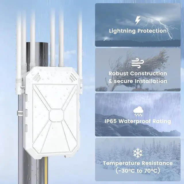 IP67 Weatherproof Armor Built to Endure: Don't let rain, snow, dust, or extreme temperatures interrupt your connection. Featuring a rugged IP67 waterproof shell, this outdoor WiFi access point is engineered to thrive in any harsh outdoor environment, guaranteeing reliable, all-weather performance year after year.