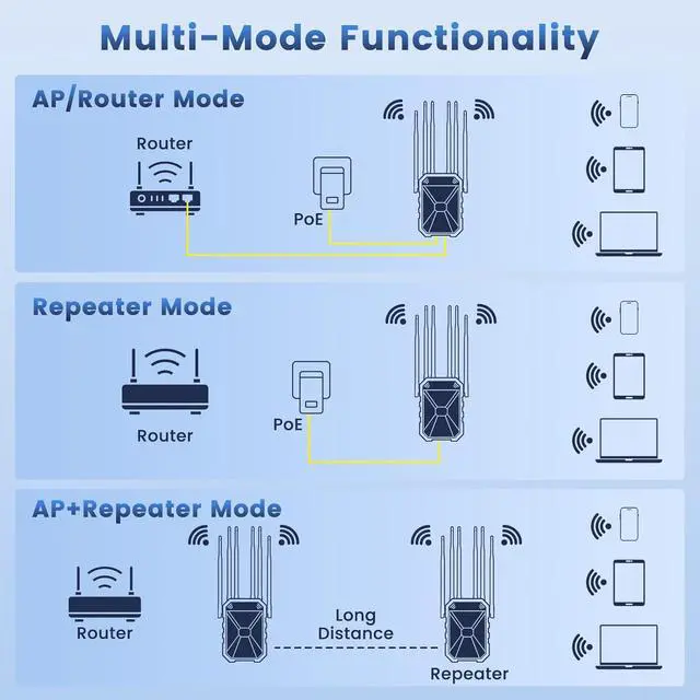 Ultimate Versatility with Multiple Operation Modes: One device, endless possibilities. Easily switch between AP, Router and Repeater modes to create the perfect network for any scenario. It's the ultimate, all-in-one outdoor wireless access point solution for extending your home network or creating a new one. Its compatible with over 99% of routers, including Starlink, seamlessly integrating into your current home network.