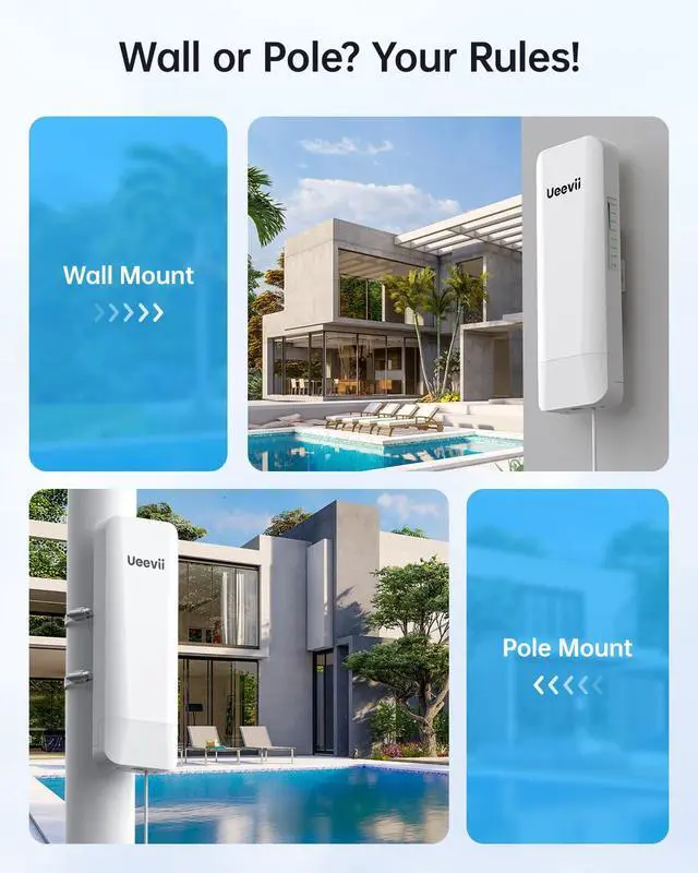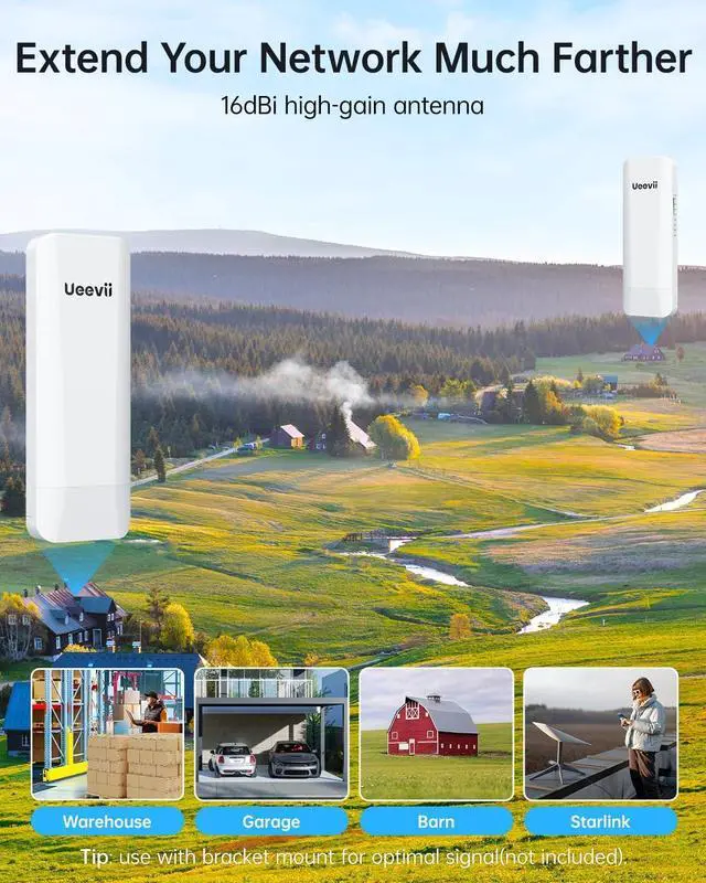 Stable 5.8GHz Performance: Experience ultra-fast data speeds on the 5.8GHz band with the Ueevii wireless bridge, offering low latency, high bandwidth, and superior interference resistance, keeping your shed, workshop, or guest house connected without interruptions.