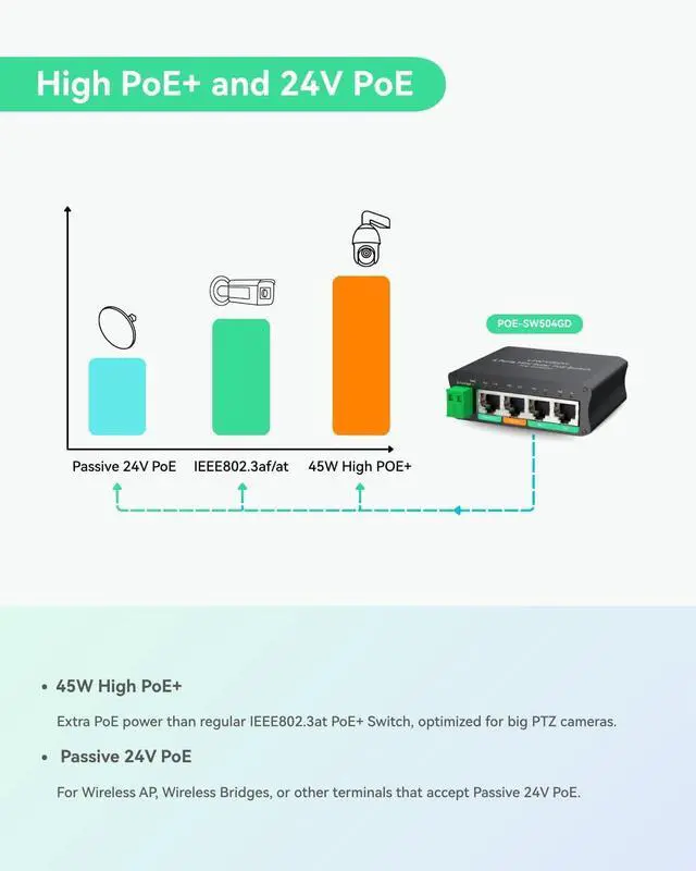 45W HIGH PoE+ OUTPUT: Optimized for big PTZ cameras, such as multiple-lens PTZ cameras, high speed dome cameras, cameras with big white LED light.