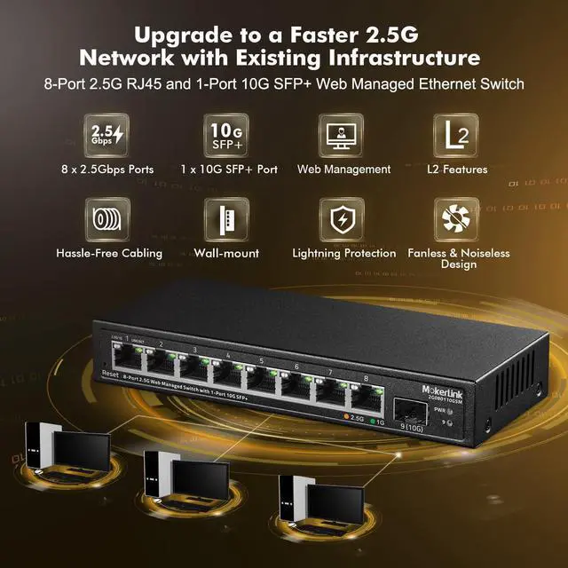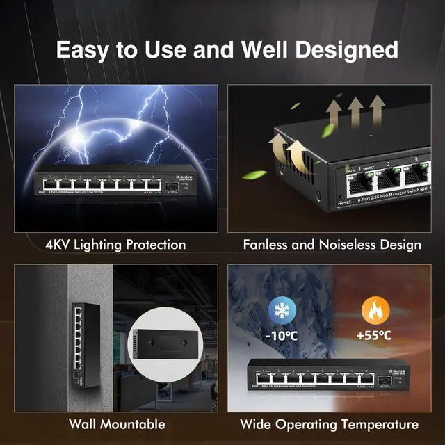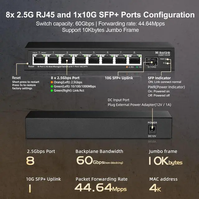 8x2.5G Ports: The network switch has 8 x 2.5Gigabit Ethernet Ports, compliant IEEE802.3bz (2.5G) standard, support 10/100/1000M/2.5G adaptive. 1 x 10G SFP+ Port(compatible 1G/2.5G Module, not include SFP Module). 60Gbps backplane bandwidth, excellent data forwarding performance